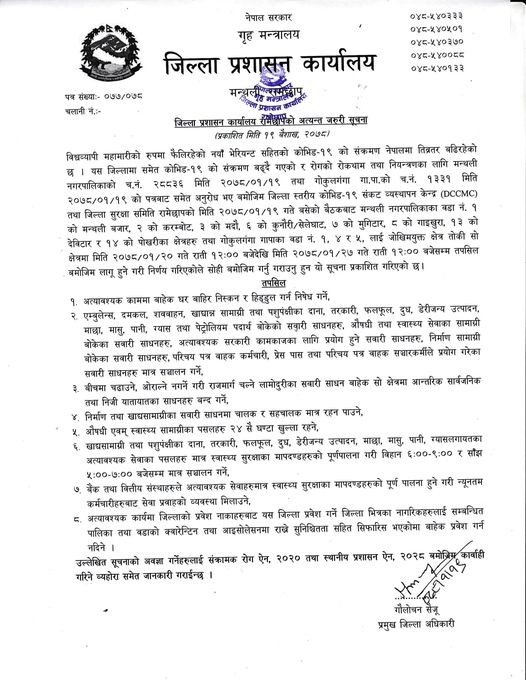 निषेधाज्ञा अवधिभर अत्यावश्यक काम बाहेक घरबाहिर निस्कन, हिडडुल गर्न पूणर् रुपमा रोक लगाइने छ ।
