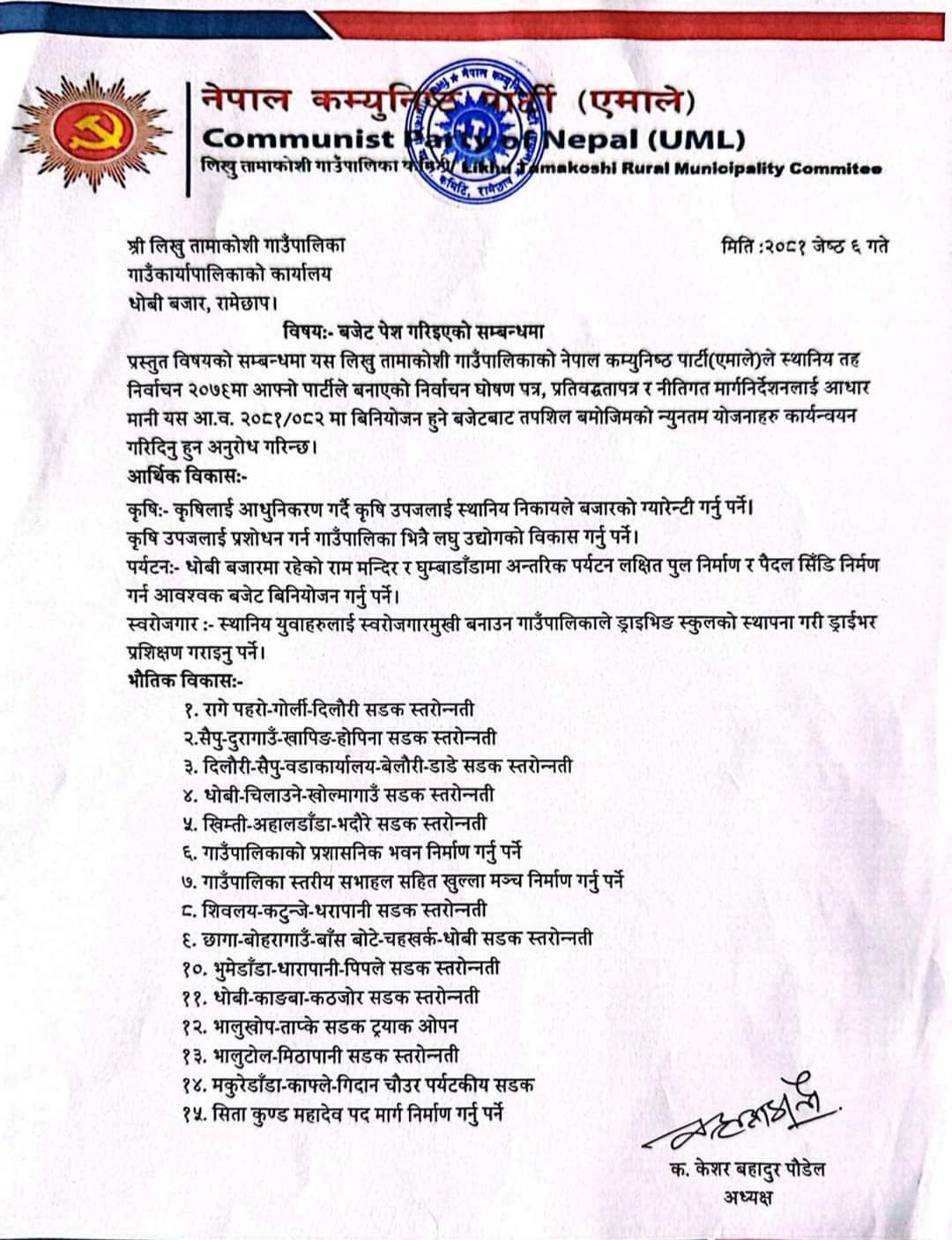 असार ६ रामेछाप ,नेकपा( एमाले)ले लिखु तामाकोसी गाउँपालिका कमिटीले साेही गाउँपालिका प्रमुखलाई आउने आर्थिक बर्षमा पालिकामा समावेश गर्नुपर्ने न्यूनतम याेजनाहरू कार्यान्वयनकाे लागि १५ बुदे याेजनाकाे सूची बुझाएको छ ।