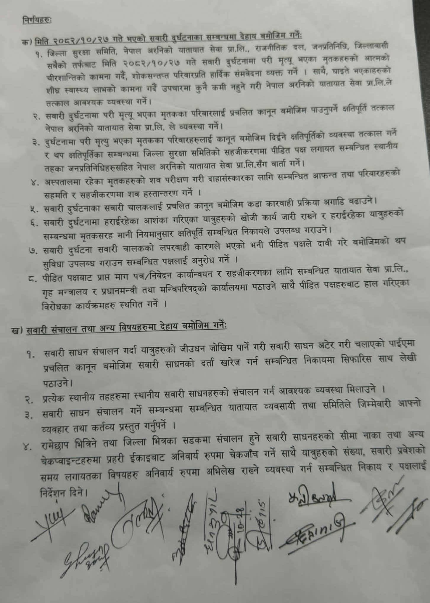 सहमतिमा सवारी चालकलाई प्रचलित कानून बमोजिम कारवाही प्रक्रिया अगाडि बढाइने भएको छ । दुर्घटनामा हराइरहेका आशंका गरिएकाको खोजी जारी राख्ने र हराईरहेका यात्रुको सम्बन्धमा पनि क्षतिपूर्ति सम्बन्धित निकायले उपलब्ध गराइने भएको छ ।